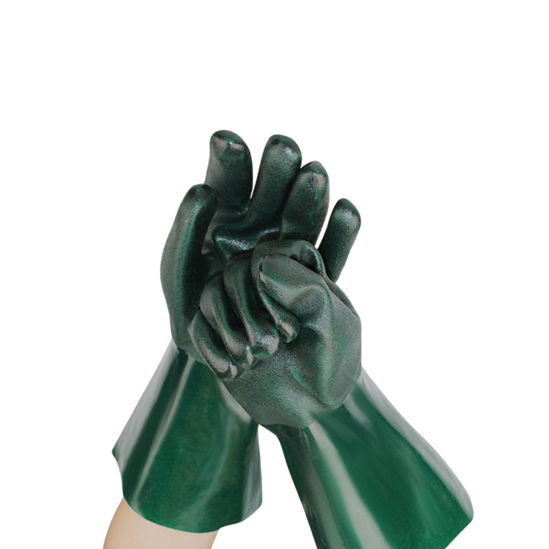 High Quality Long Cuff Oil and Chemical Resistant PVC Gloves Anti Slip Dark Green PVC Dipped Flannel Lining Hand Work Gloves
