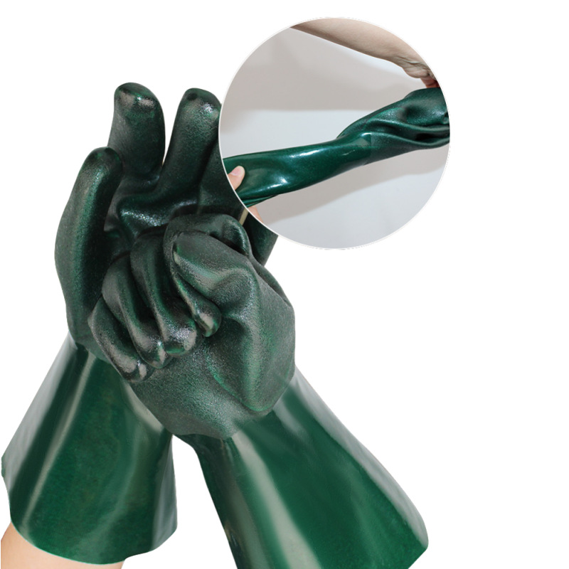 High Quality Long Cuff Oil and Chemical Resistant PVC Gloves Anti Slip Dark Green PVC Dipped Flannel Lining Hand Work Gloves