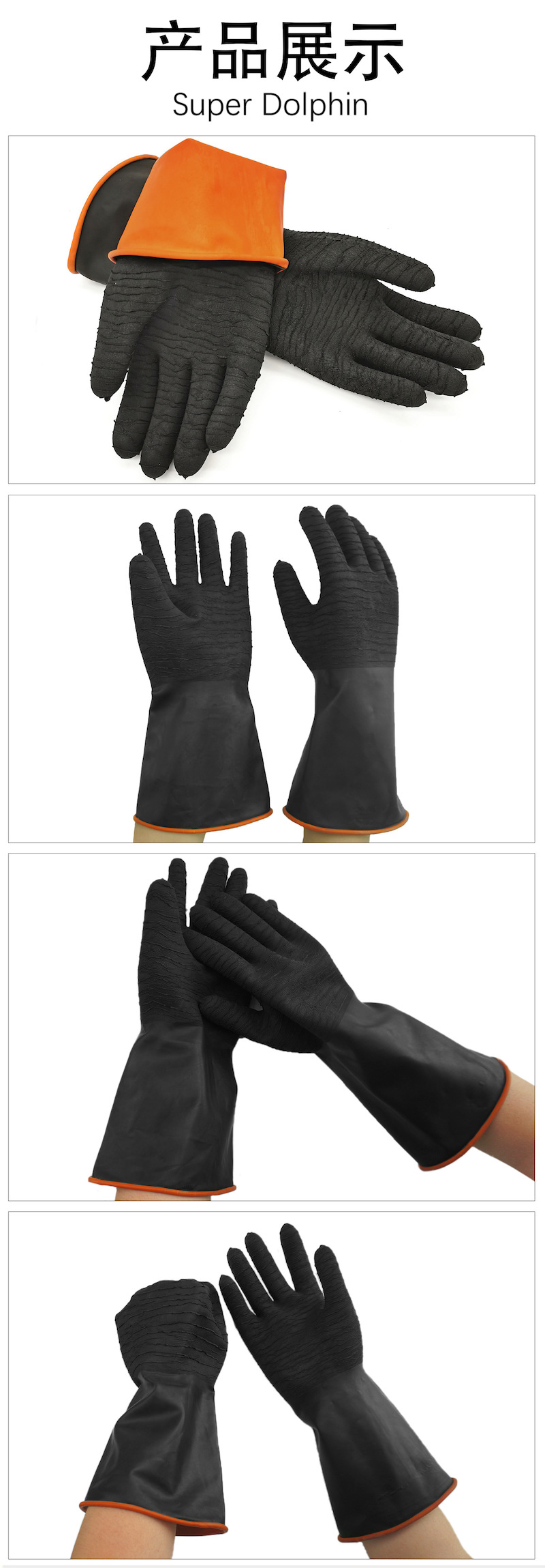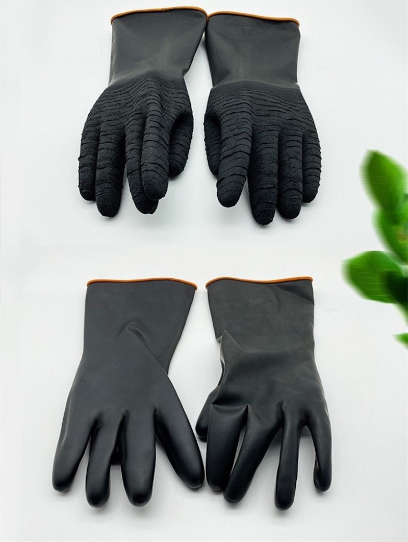 Industrial black long-length latex gloves are professional protective equipment designed specifically for industrial scenarios that require comprehensive hand and forearm protection. Unlike short-style latex gloves, these gloves feature an extended length (typically 30cm-60cm) that covers the entire hand and extends to the mid-forearm, effectively shielding against chemical splashes, corrosive liquids, scratches, and contamination.
